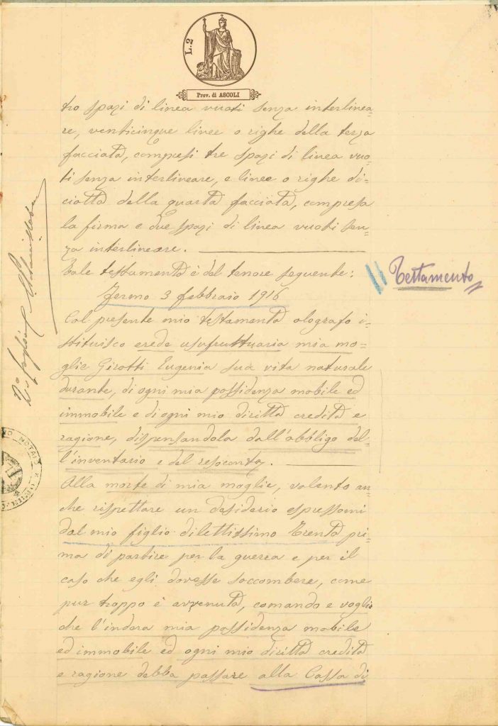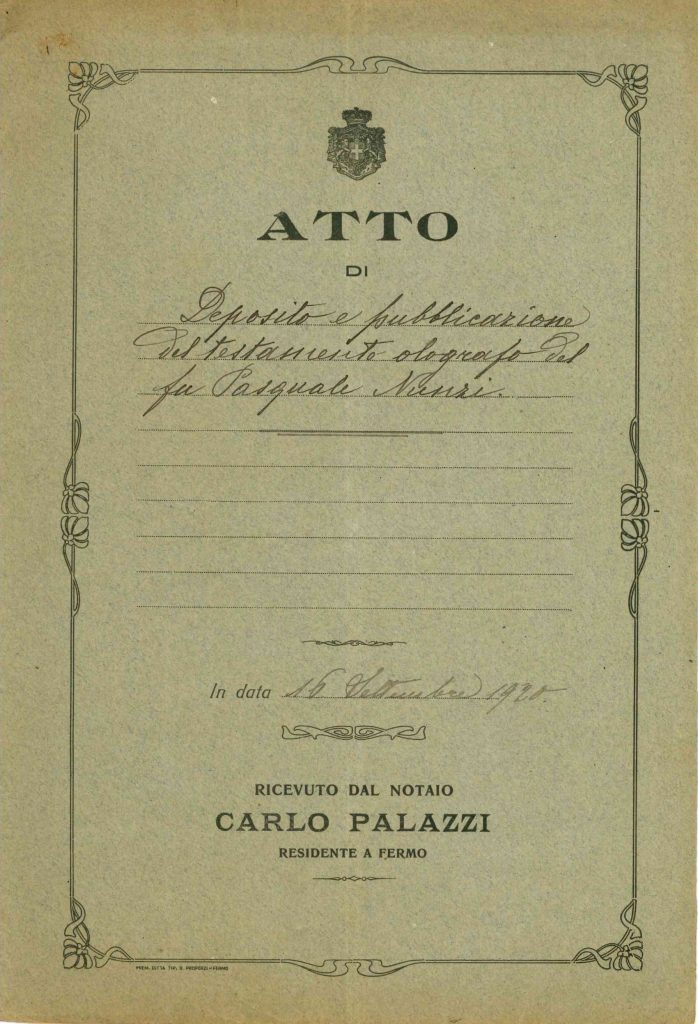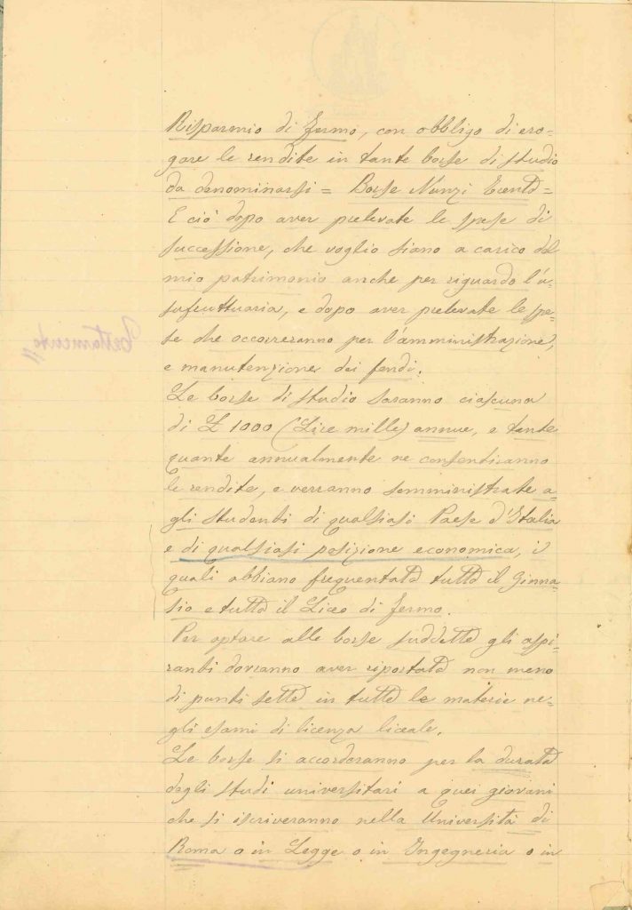 “…volendo anche rispettare un desiderio espressomi dal mio figlio dilettissimo Trento prima di partire per la guerra e per il caso che egli dovesse soccombere, come purtroppo è avvenuto, comando e voglio che la intera mia possidenza mobile ed immobile ed ogni mio diritto credito e ragione debba passare alla Cassa di Risparmio di Fermo, con obbligo di erogarne le rendite in tante borse di studio da denominarsi = Borse Nunzi Trento =…..” (estratto del testamento olografo del defunto Pasquale Nunzi, 3 febbraio 1916).